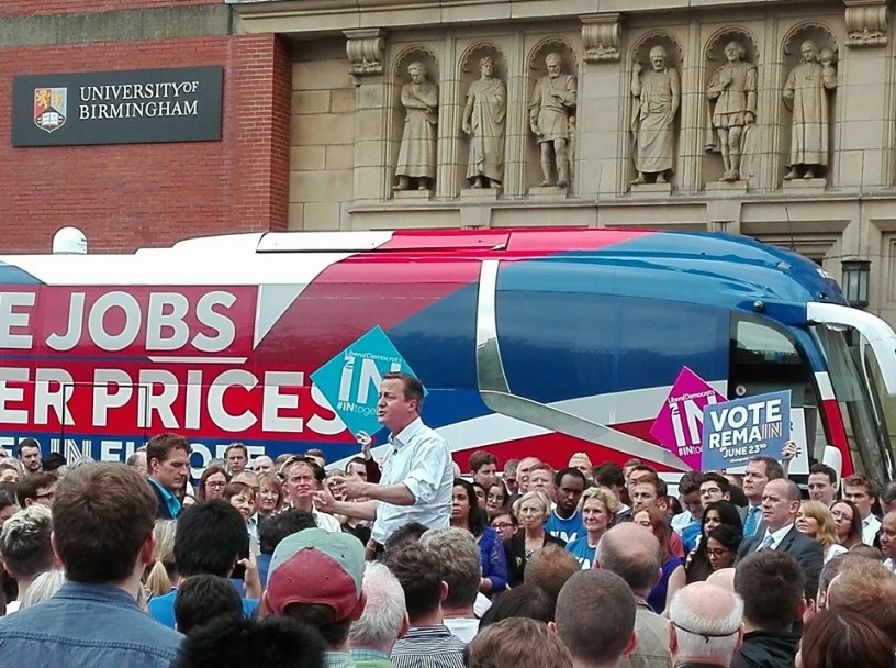 In the last week alone I managed to break the screen of my mobile phone, the zip of my rucksack, temporarily freeze my laptop just before of a work trip abroad, remembering too late a dinner invitation for which shaving and a lounge suit were required. Today I packed my old trolley for a three day trip to Birmingham for IRiS Superdiversity conference (#SD2016). I took an early train to Coventry to give a breakfast talk on the EU referendum and migration. I haven’t spoken in public about the referendum – because I feel too personally involved, I guess. A friend asked me to talk about the diary long ago, I accepted and didn’t think about what to say until the last minute.The referendum campaign has been an emotional roller-coaster. Somehow I managed to put together a few slides on the train. After the talk (I’ll write a separate entry for it), had to rush to Birmingham for a series of meetings. I arrived in time, but not my trolley that instead was left on a Virgin train to Glasgow. Moments of panic followed. I realised at the door of my office that i didn’t have my keys, cameras, jacket, shirts, shaving cream, socks, toothbrush etc etc. Gladly a colleague encouraged me to cancel a meeting and go shopping and my partner helped me with endless phone calls at left luggage offices. The luggage has not being found yet – at least this is as far as we know as the office in Glasgow hardly answers the phone. But a trip to Primark saved my day (sorry, I know it is very bad but had less then a hour to buy a whole wardrobe for 3 days). Back on campus and after the last meeting of the day, i was heading to the hotel when I overheard some clapping and shouting. The Remain campaign was having its (semi-secret for us) closing initiative on campus. The colorful Remain bus was parked in front of the university main building and Gordon Brown, Caroline Lucas, Tim Farron and David Cameron were there giving passionate speeches to a small crowd of cameramen, journalists, senior academics and random passerby. Not a great fan of some of them, but I needed a small injection of passion to survive another day of this extenuating referendum campaign.